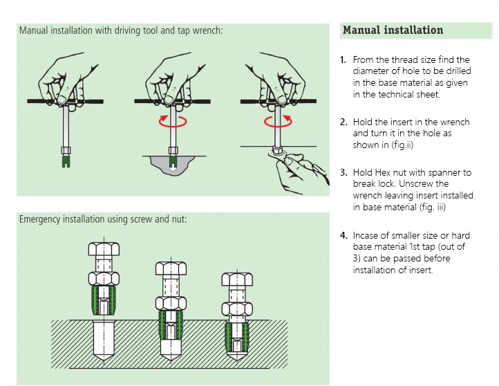 The installation of Navbharat Self Tapping Threaded Inserts is simple and quick, using only one tool, which lowers installation cost. By tapping its own thread, the self tapping insert eliminates the need for base material to have pre-tapping.